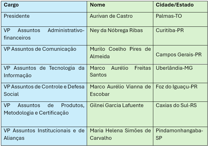 A chapa ALIANÇA PARA O FUTURO terá ainda em sua composição as destacadas representações de Ney Ribas na vice-presidência nacional, ele que é referência em Observatórios e Coordenador Nacional do projeto Força Tarefa Cidadã no Sistema OSB, e assume a presidência do Conselho Superior a senhora Lucélia da Costa Nogueira Tashima, representante do Observatório Social do Brasil-Campo Grande/MS.